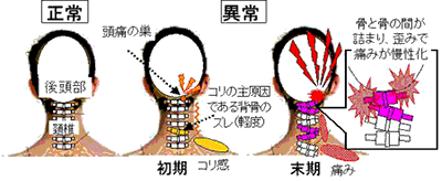 そのため、頭を支える負荷、走るなどの運動時の振動が、直接、首の付け根(後頭部あたり)と肩の付け根にかかり、そのダメージで周辺の筋肉が絶えず緊張するようになり、コリが悪化します。
